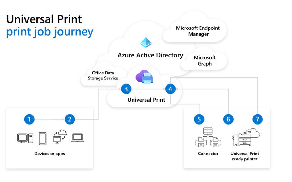 Dokumentenkonvertierung: Universal Print kann einen Auftrag in einem Format erhalten, das sich von dem Format unterscheidet, das der Drucker (oder der Connector) unterstützt. In diesem Fall ist ein zusätzlicher Schritt zur Konvertierung des Dokuments erforderlich. Zum Beispiel werden Dokumente, die von Windows 10, Version 1903 und 1909 gedruckt werden, von Universal Print im OXPS-Format empfangen. Wenn der Zieldrucker Universal Print ready ist und nur PDF unterstützt, müssen die Aufträge in PDF konvertiert werden.