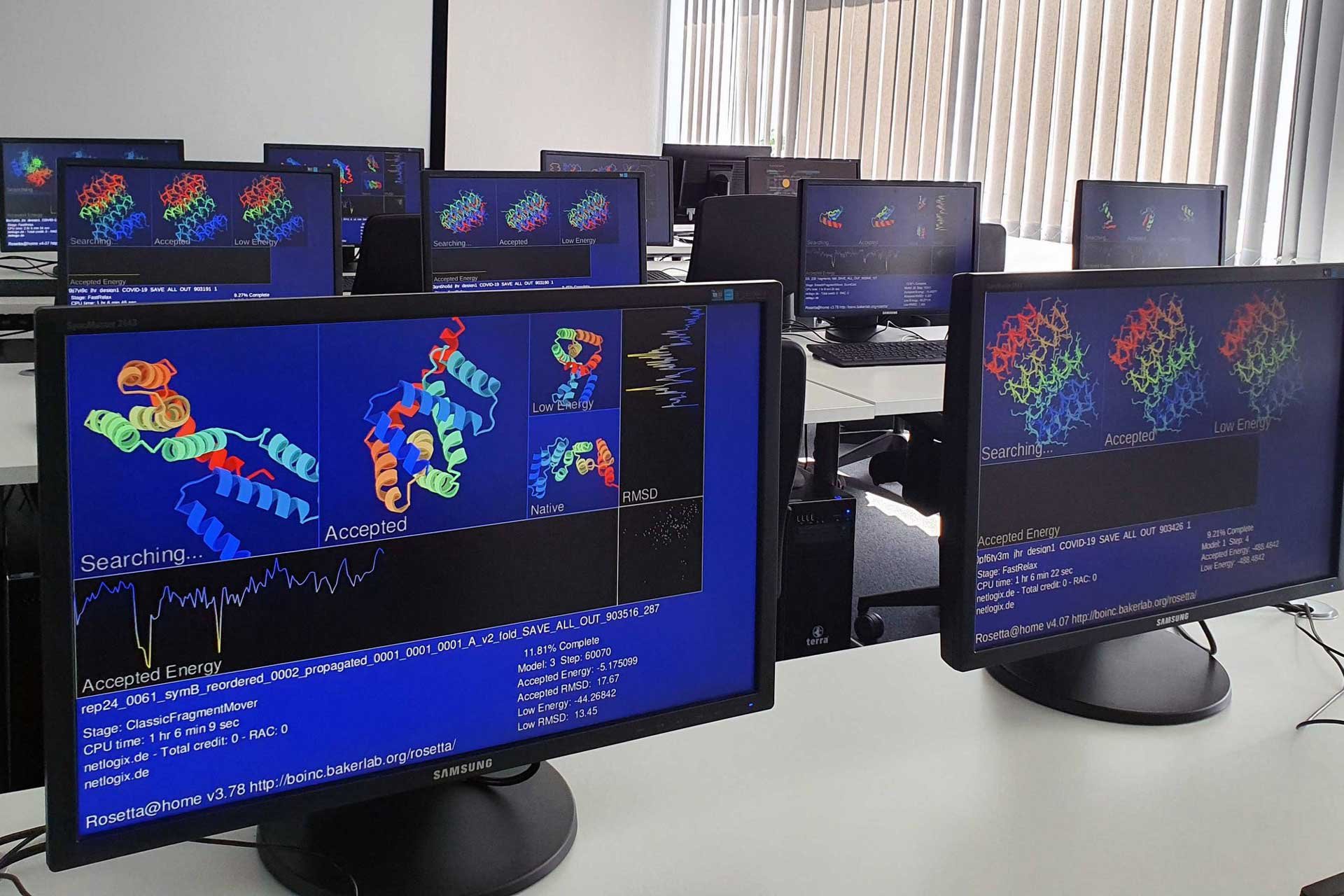 Und so arbeiten von nun an bis zu 40 Rechner in unserem Trainingscenter unermüdlich daran, für das Rosetta@home-Projekt der University of Washington Proteine zu modellieren, die bei der Entwicklung von Impfstoffen und Medikamenten gegen das Coronavirus wichtige Erkenntnisse bringen.