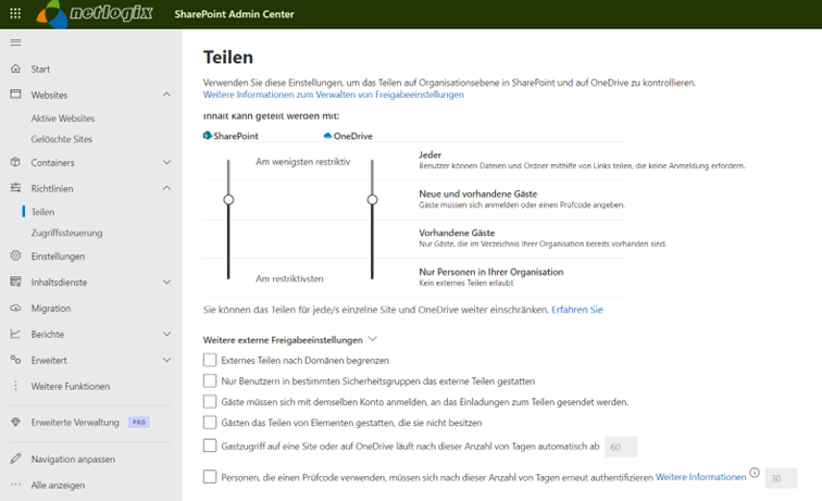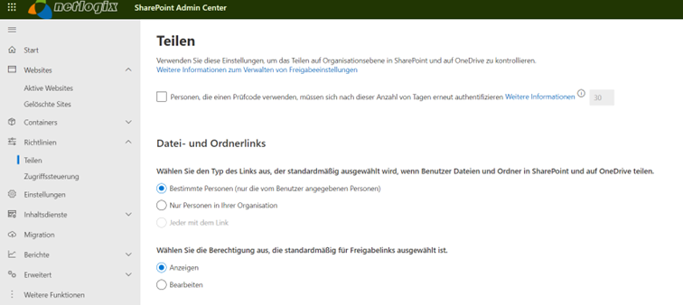 Im Admin Center können Sie das Teilen von Datei- und Ordnerlinks auf bestimmte Personen einschränken.