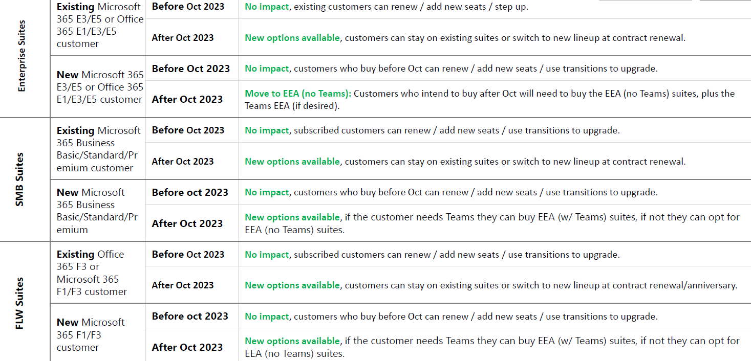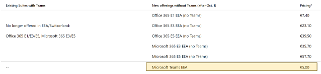 Für neue Abos gilt ab dem 1.10., dass für O365 E1/E3/E5, sowie M365 E3/E5 kein Teams mehr inkludiert sein wird, Teams muss dann separat hinzugebucht werden, falls benötigt.