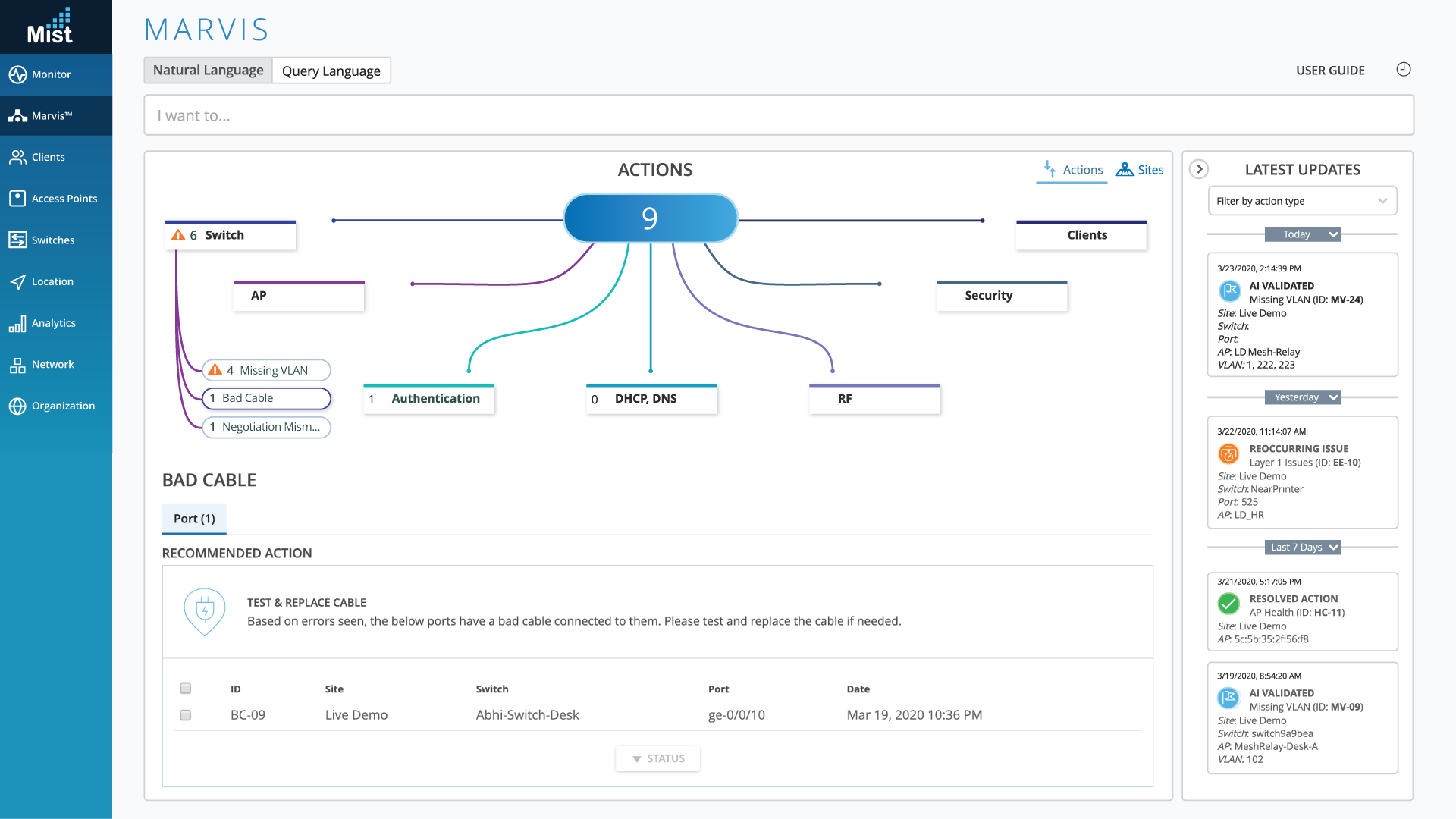 Unter AI-driven Networking verstehen wir eine Kombination aus künstlicher Intelligenz, maschinellem Lernen und Data Science-Techniken, um die User-Experience Ihrer Mitarbeiter zu optimieren und die Betriebsabläufe in den Bereichen drahtloser Zugriff, kabelgebundener Zugriff, und SD-WAN-Umgebungen zu vereinfachen.